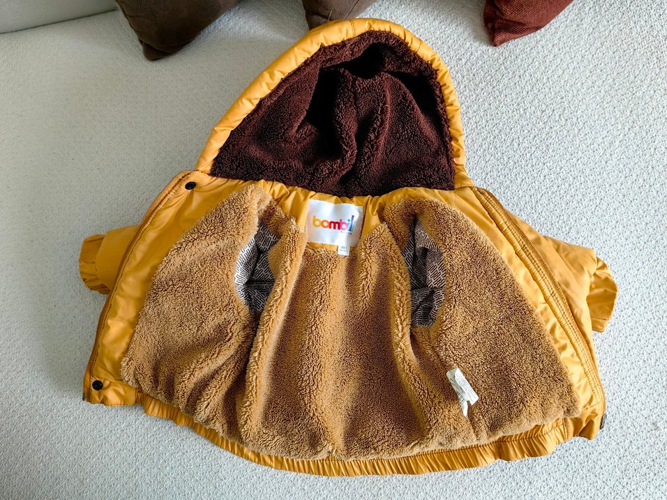 Kapüşonlu, kürk detaylı ve işlemeli desenli, yumuşak ve sıcak kumaş astarlı kahverengi erkek çocuk montu.