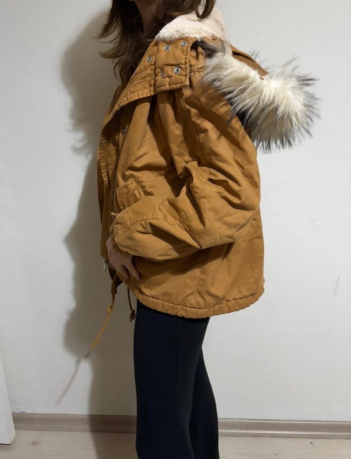 Kahverengi, kürk detaylı ve yumuşak astarlı kadın kışlık ceket. Notlu yaka ve bol kesimiyle rahat sokak stili için uygun.