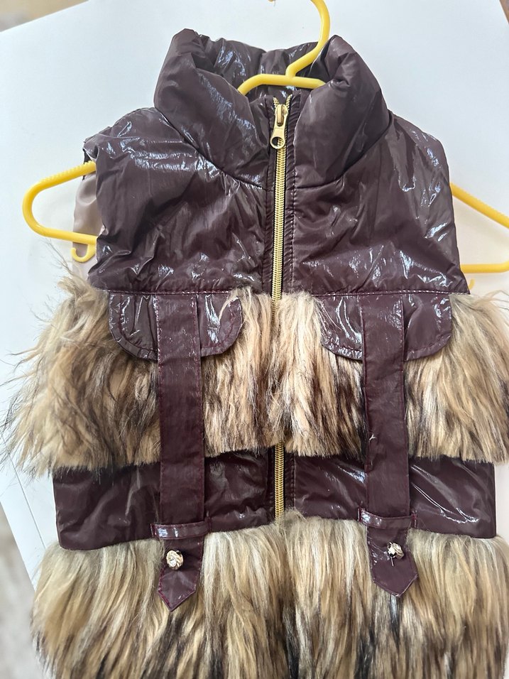 Kahverengi sentetik kumaştan yapılmış, kürk detaylı, halter yaka ve askılı kollu, normal midi boyda, desen içermeyen kadın yeleği. Dış mekan sokak stili için uygundur.