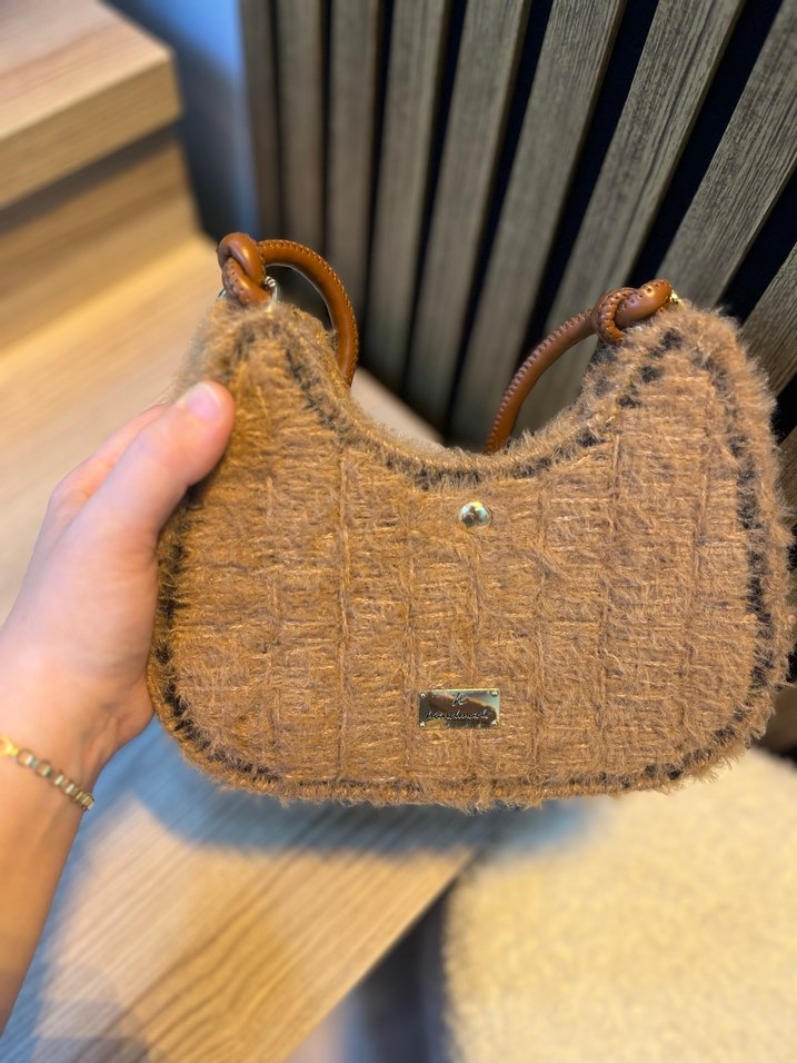 Kürk Detaylı Kahverengi Örgü Kadın Çanta