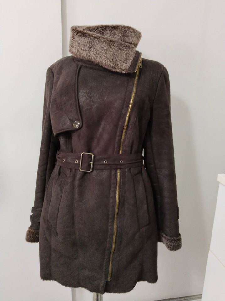 Kahverengi süet biker ceket, kürk detaylı yaka ve manşetlere, kemerli bele ve asimetrik fermuara sahiptir. Sıkı kesimi ve strappy kollarıyla şık ve rahat bir görünüme sahiptir.