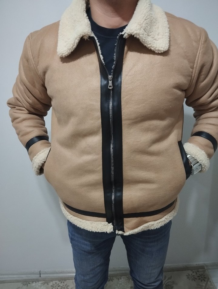 Kahverengi süet malzemeden yapılmış, kısa ve regular fit erkek ceket. Kürk detaylı yakası, manşetleri ve etek ucu ile zipli ön kapama ve uzun kolludur.