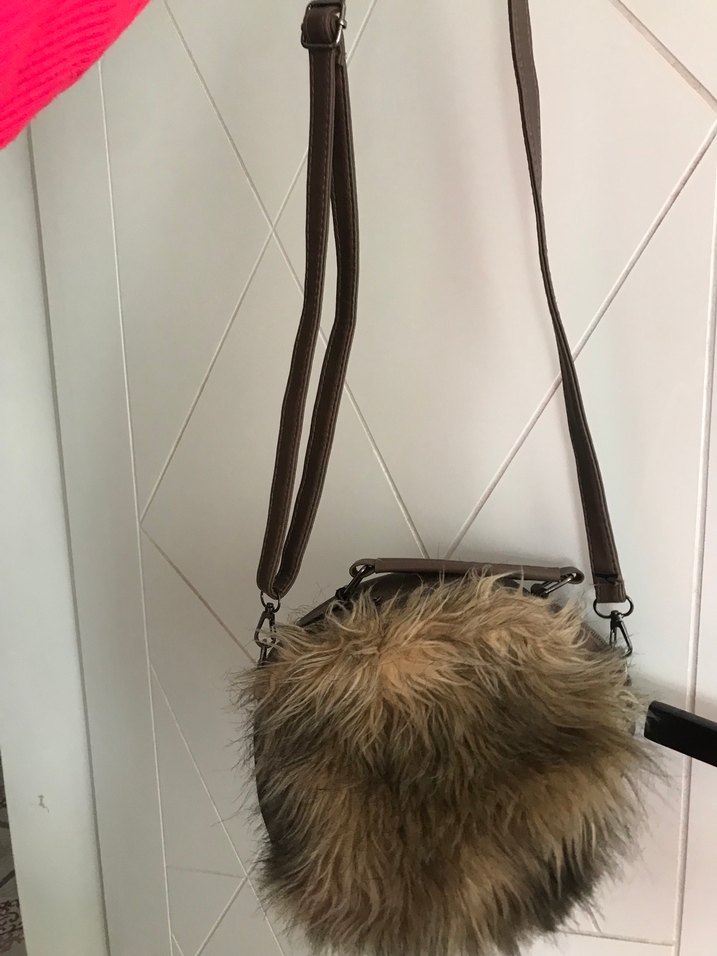 Kahverengi süet kadın çanta, kürk detaylı ve leopar desenli. Rahat bohem tarzıyla günlük kullanıma uygun.