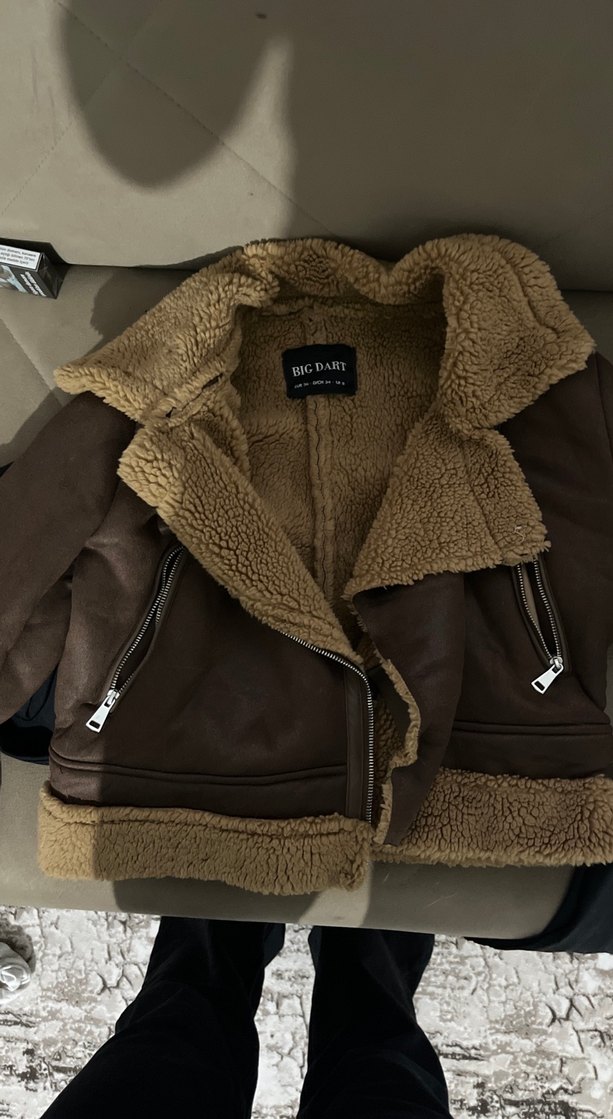 Kahverengi süet, kürk detaylı, uzun kollu, normal uzunlukta, yakası çıtçıtlı, sade ve rahat kadın ceket. Çok sıcak tutuyor iki kere anca giymişimdir