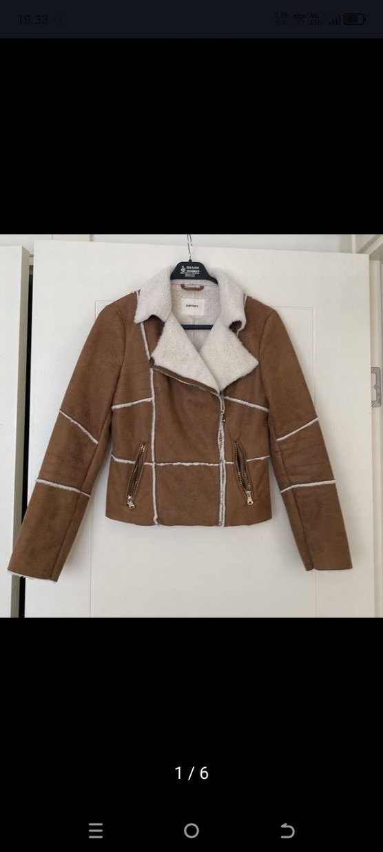 Kahverengi süet ceket, kürk detaylı ve yaka kısmı notched lapel. Kısa boy, regular fit ve fermuarlı ceplidir, rahat sokak stiline uygundur.