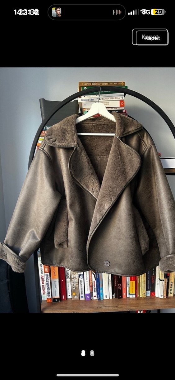 Kahverengi süet kadın ceketi, bol kesim ve kısa boydadır. Uzun kollu, kürklü iç ve manşet detaylarına sahip, yaka tipi kesik yakadır. Sokak stili tarzındadır. Marka temsili butik ürün