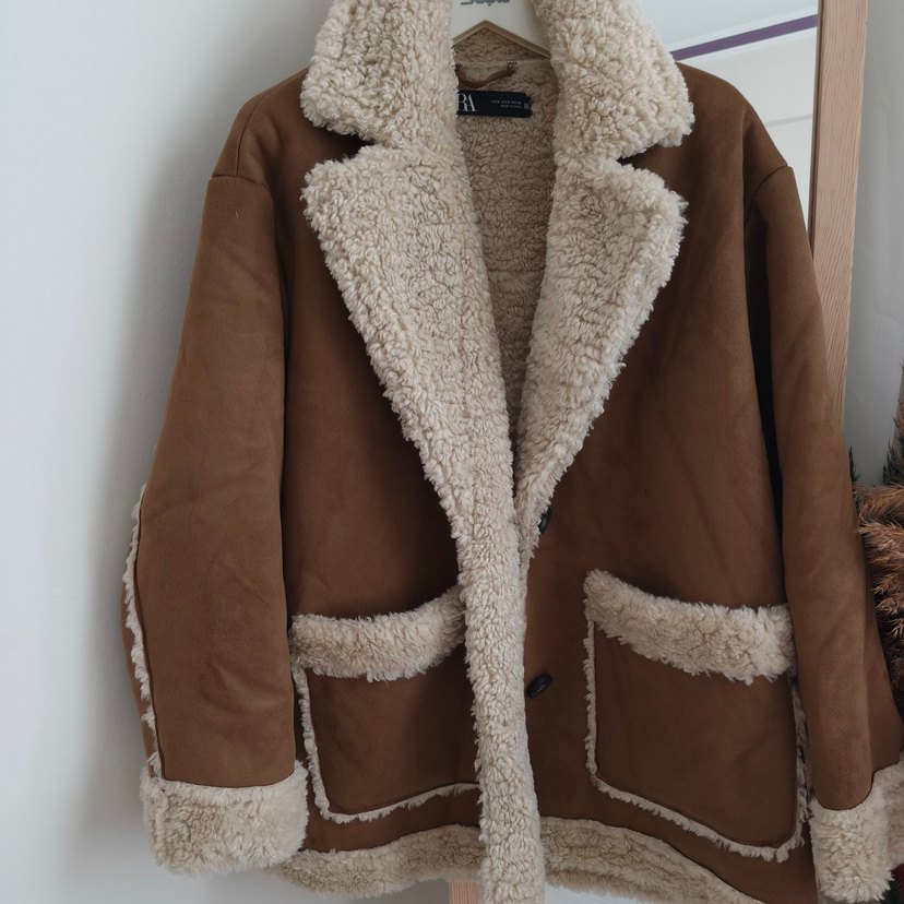 Kürk detaylı, süet kumaştan yapılmış, rahat kesimli kahverengi kadın kışlık ceket. Normal midi boyda, yakası kesik, askılı kollu ve desen içermeyen tasarım. indirim payı vardır