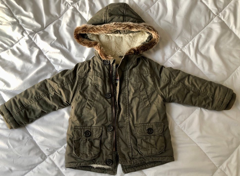 Kürk detaylı kapüşonlu, kamuflaj desenli, dar kesim erkek çocuk montu. Yumuşak ve sıcak fleece kumaştan, kahverengi ve gri tonlarda.