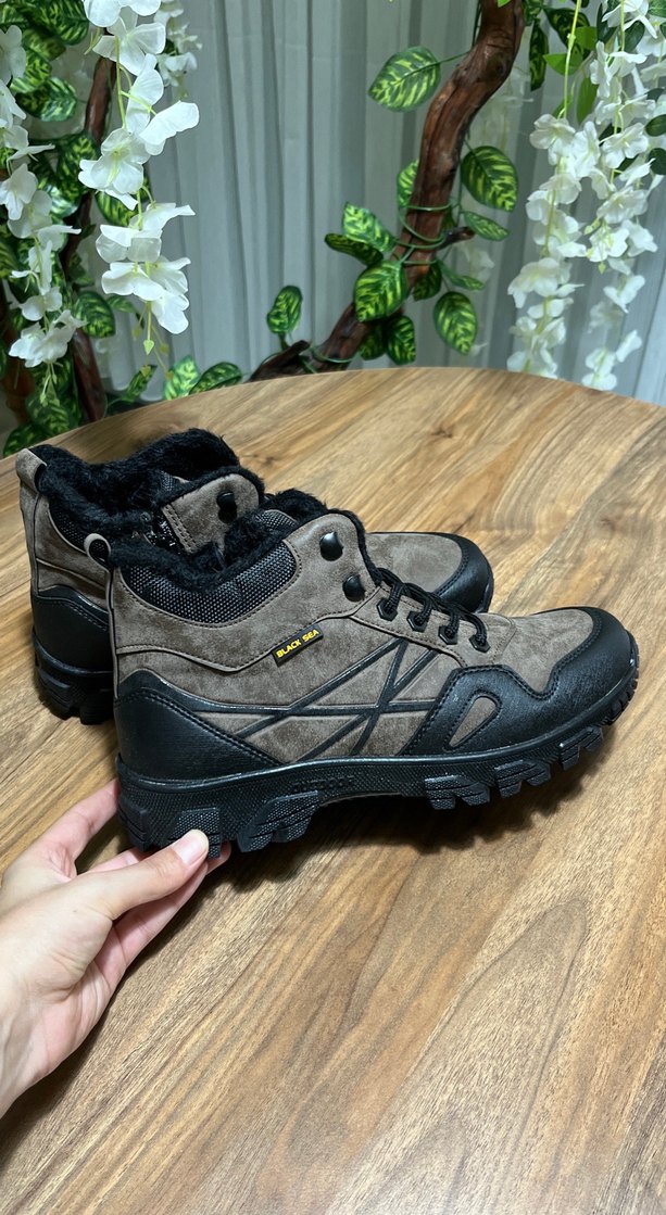 Kürk astarlı, kamuflaj desenli erkek outdoor botu. Rahat ve trend sokak stili için kahverengi ve gri tonlarında, dayanıklı tabanlı.