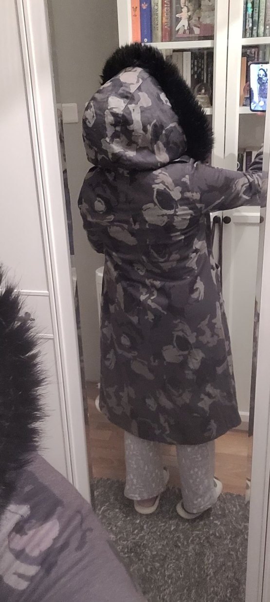 Bu uzun gri parka, kamuflaj desenli ve bol kesimdir. Sentetik kumaştan üretilmiş, uzun kollu ve kürklü kapüşonu vardır. Sokak stili için uygundur.