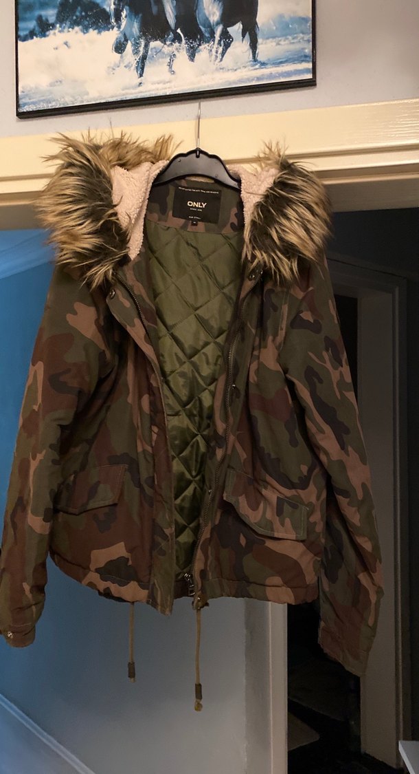 Kürk detaylı kapüşonu ve kamuflaj deseniyle, bol kesim ve yakası kesik detaylı kadın kışlık mont. Yumuşak ve sıcak kumaştan, rahat sokak stili için uygundur.