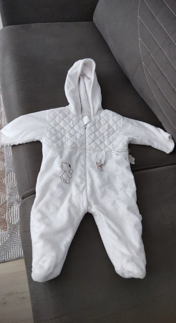 Kapüşonlu, kürk detaylı beyaz bebek tulumu. Gri nakışlı desenlerle süslenmiş, soğuk havalar için sıcak ve rahat bir seçim. ❄️ bebeğim için aldım şuan büyüdü fermuarlı