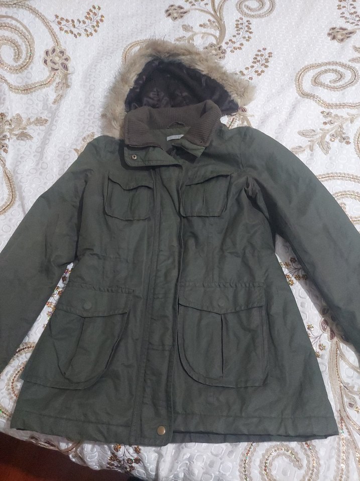 Kahverengi, normal boyda kadın kış kabanı, kapüşonlu ve kürk detaylıdır. Yumuşak kumaştan yapılmış, uzun kollu ve cepli, dış mekan sokak stiline uygundur.