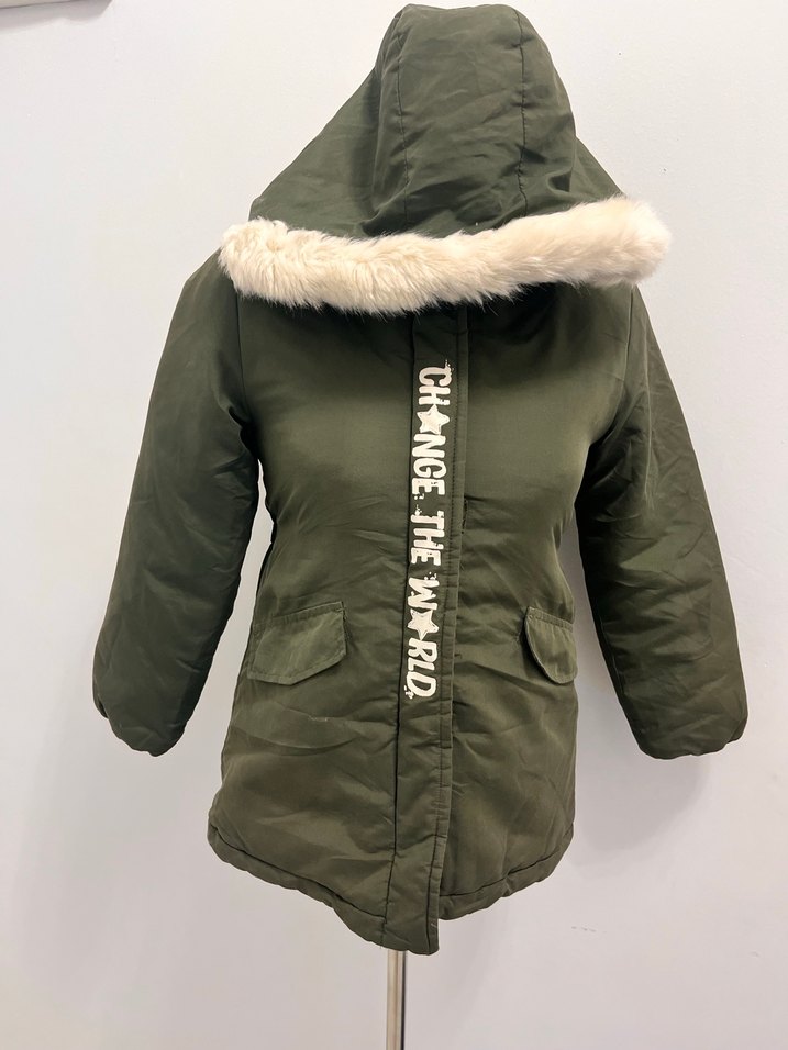 9-10 yaş Kürk detaylı kapüşonlu, uzun kollu ve yeşil renkli kadın kışlık mont. Yumuşak ve sıcak kumaştan, önü baskılı yazılıdır. Rahat ve sıcak tutar, dış mekan kullanımı için uygundur.