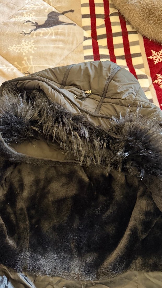 Bu kadın kışlık mont, kürk detaylı kapüşon ve uzun kesime sahip, gri renkte. Sentetik kumaştan yapılmış, rahat ve sokak stili için uygun.