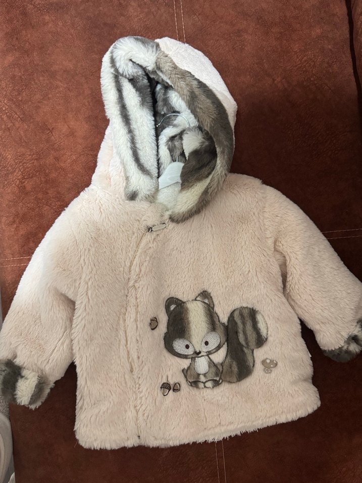 Kürk detaylı kapüşonlu, baskılı sincap desenli, kahverengi ve gri tonlarda, yumuşak ve sıcak kumaştan yapılmış, kız çocuklar için dar kesim ceket.