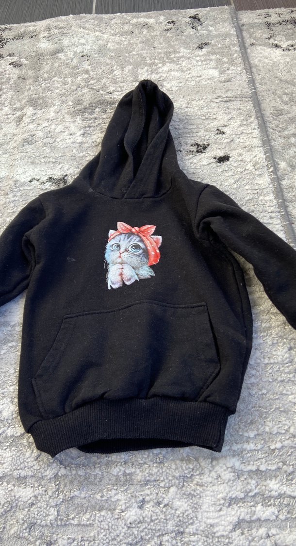 Koyu gri renkte, kürk detaylı kedi baskılı kapüşonlu sweatshirt. Ön cepli ve ribanalı manşetlere sahip, sokak modası stilinde. 1 2 yaş
