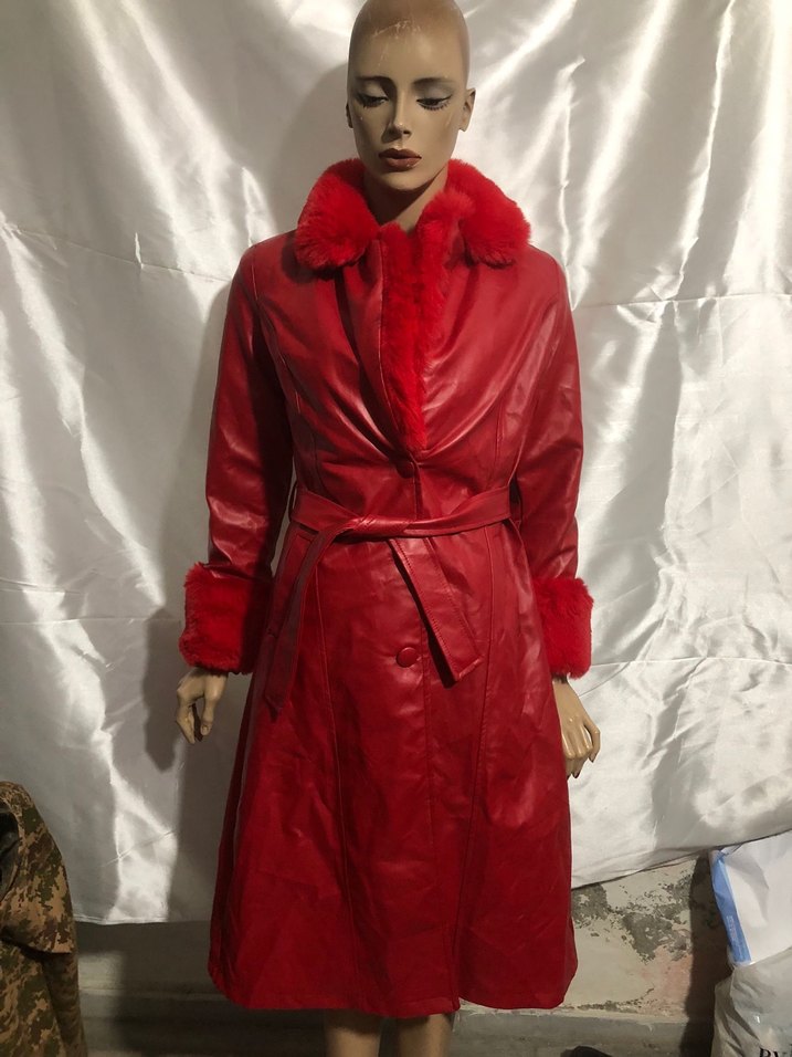 Kürk Detaylı Kırmızı Deri Kadın Kaban/Trenç