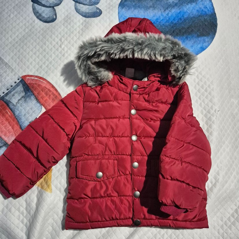 Kürk detaylı kapüşonlu ve kesikli yaka ile kırmızı, fitted erkek bebek mont. Yumuşak ve sıcak kumaştan, streetwear tarzında rahat bir model. Kürk kismi cikarilabilir. Ürün cok temiz ve defosuzdur. Beden 74-80cm