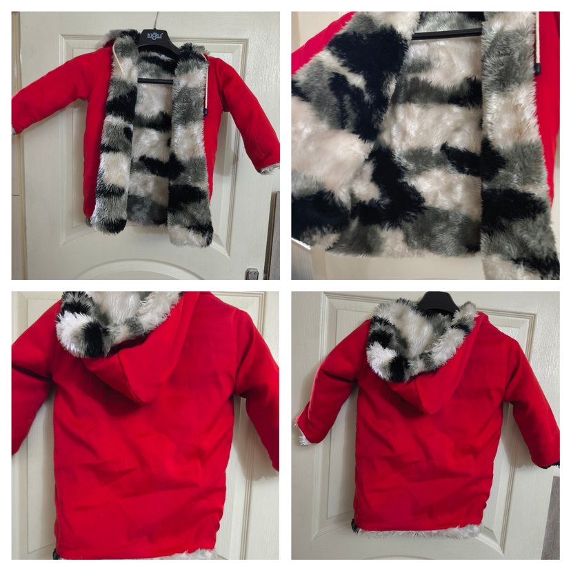 Kürk detaylı, kapüşonlu ve yakalı bu kırmızı erkek çocuk kabanı, gri ve siyah desenli yumuşak kürk iç kısmıyla şık bir sokak stili sunar.