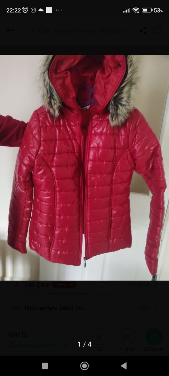 Parlak kırmızı sentetik kumaştan, kürk detaylı kapüşonlu, uzun kollu, kısa kesim ve dar kesim kadın kışlık kaban. Sokak stili için uygundur. ❄️