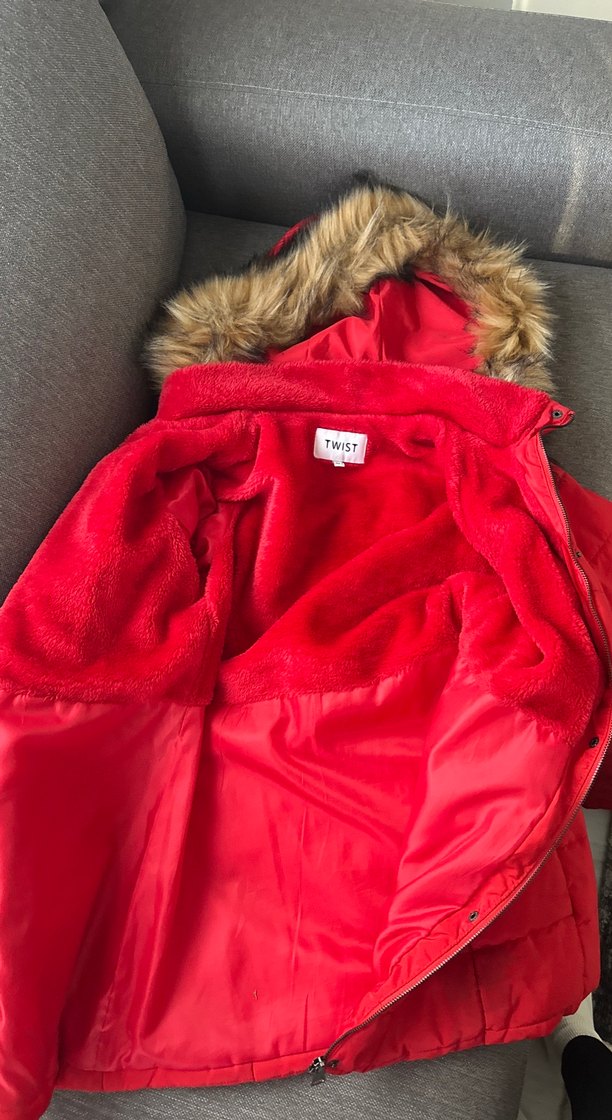 Kürk detaylı kapüşonlu, kırmızı ve yumuşak fleece kumaştan yapılmış, normal uzunlukta ve fitted kesim kadın kışlık mont. Günlük kullanıma uygun, parlak görünümlü.
