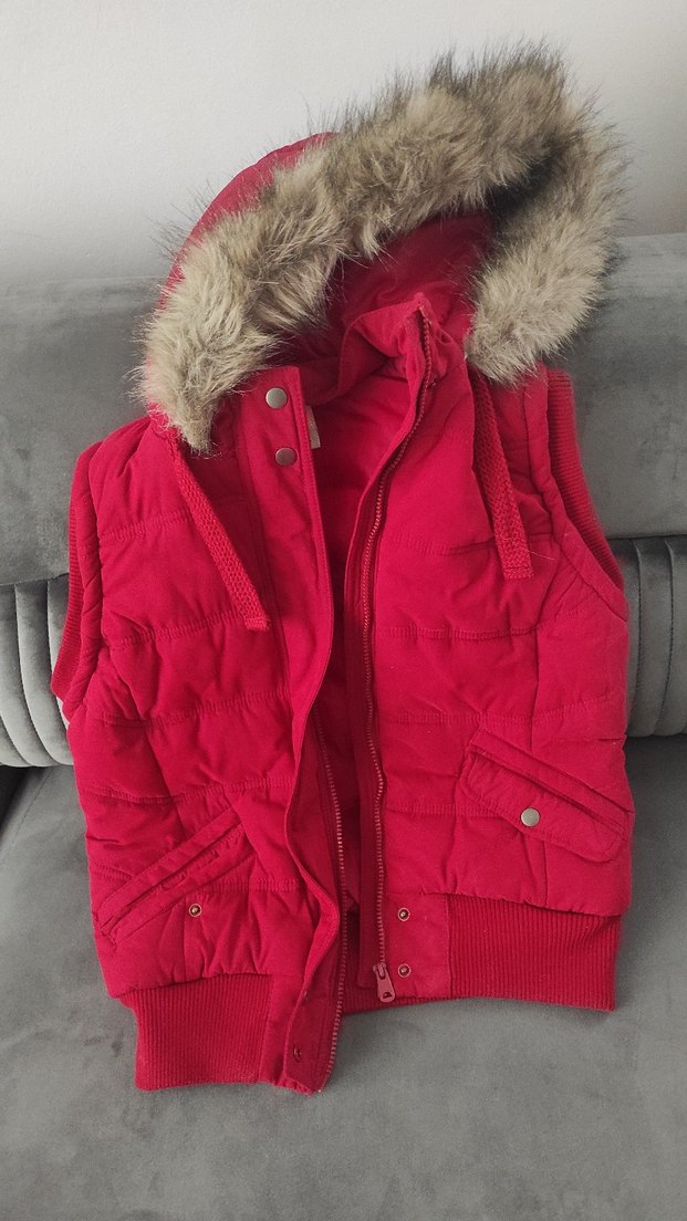 Kürk detaylı kapüşonlu, kırmızı renkli, kolsuz kadın kışlık yelek. Fitted kesim, normal boy ve yumuşak, sıcak kumaştan üretilmiştir. hiçbir defosu yoktur