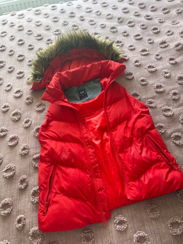 Kürk detaylı kapüşonlu, yüksek yakalı kırmızı kadın şişme yelek. Yumuşak fleece kumaştan, kolsuz ve vücuda oturan kesimde, dış mekan kullanımı için uygun.