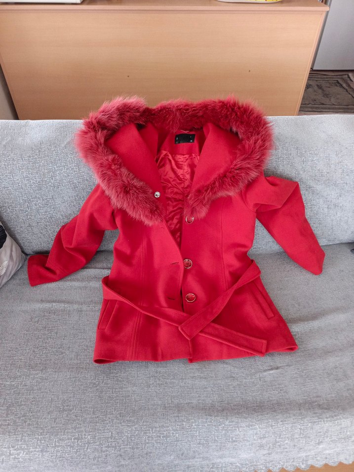 Kürk detaylı kapüşonlu, uzun kollu, yumuşak dokulu kırmızı kısa kaban. Notlu yaka ve kemerli, şık ve rahat bir tasarım.