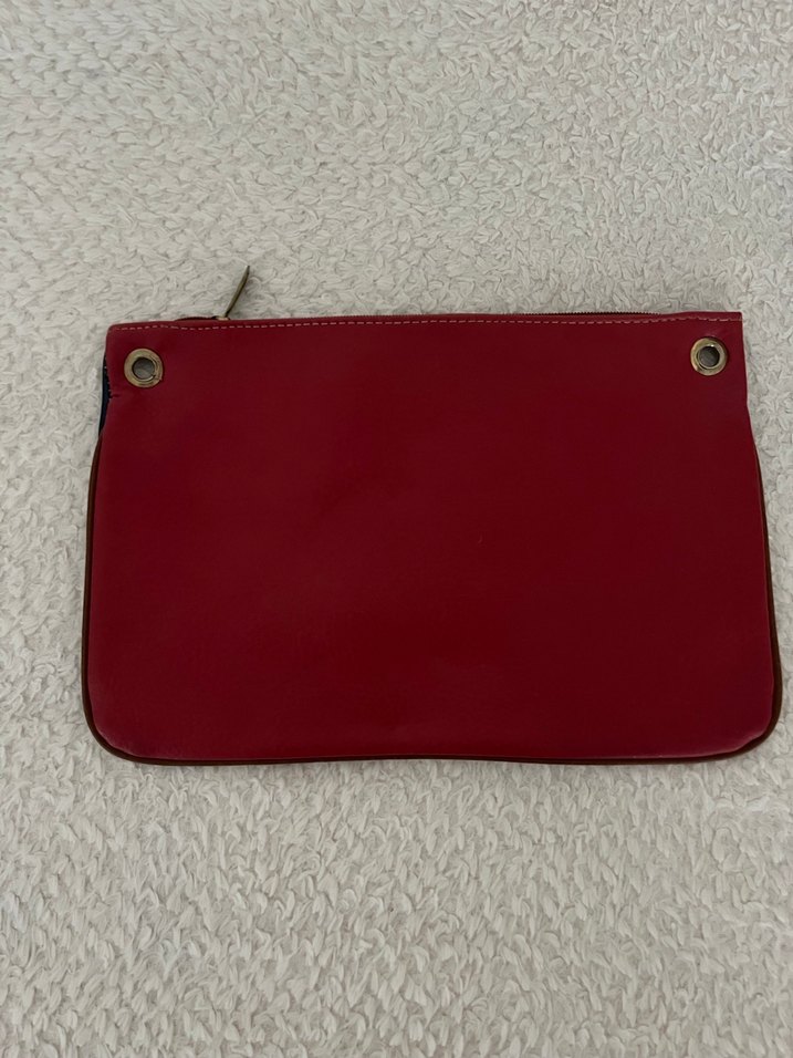 kırmızı ve lacivert arkalı önlü kullanılabilen deri kadın clutch çanta, desen içermeyen minimalist ve çağdaş tasarıma sahiptir. Günlük kullanıma uygundur ve metal halkalarla süslenmiştir.El çantası portföy