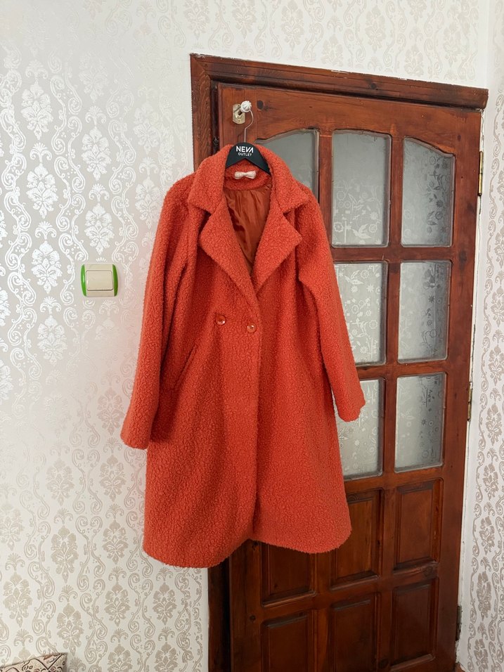 Yumuşak ve sıcak tüylü kumaştan yapılmış, kürk detaylı uzun, bol kesim kadın kaban. Notlu yaka ve pastel kırmızı renkte, günlük kullanıma uygun. Bir kere tek giyildi.