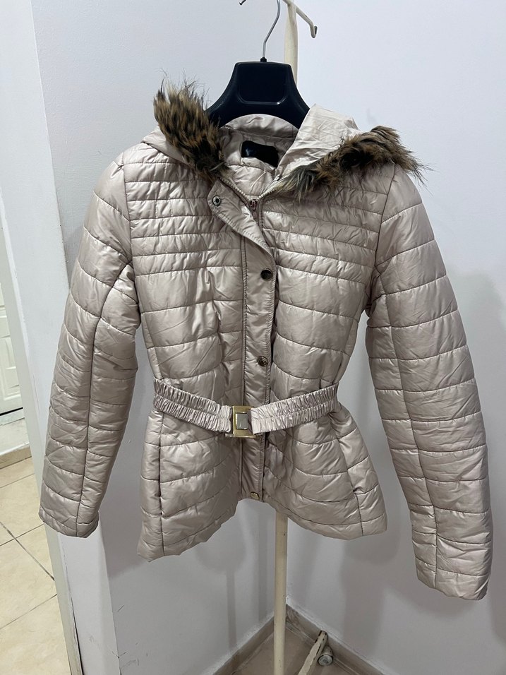 Kürk detaylı kapüşonlu, kemerli ve kısa kesim bej kadın kışlık mont. Sentetik kumaştan, günlük kullanıma uygun, trend sokak stili için ideal. ❄️