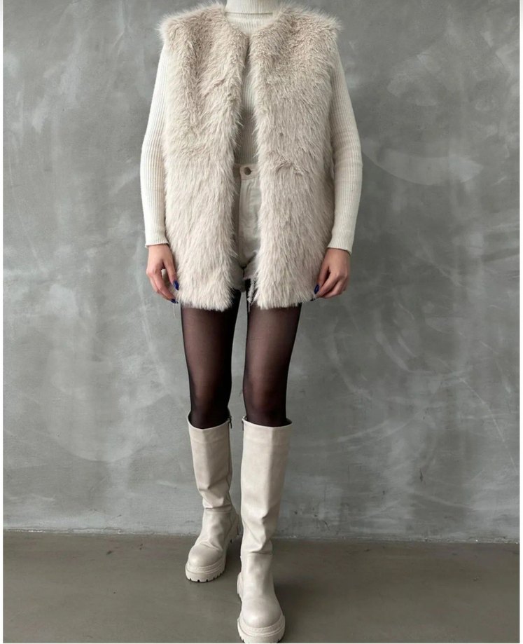 Yüksek yakalı, kürk detaylı, kısa beyaz kadın yelek. Rahat ve şık, sokak modasına uygun, suni kumaştan üretilmiştir. hiç giyilmedi