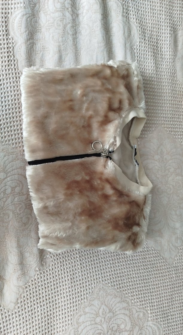 Bej renkli, kürk detaylı kısa kadın hırka . uzun kollu, yumuşak ve sıcak dokulu kumaştan, günlük kullanıma uygun.