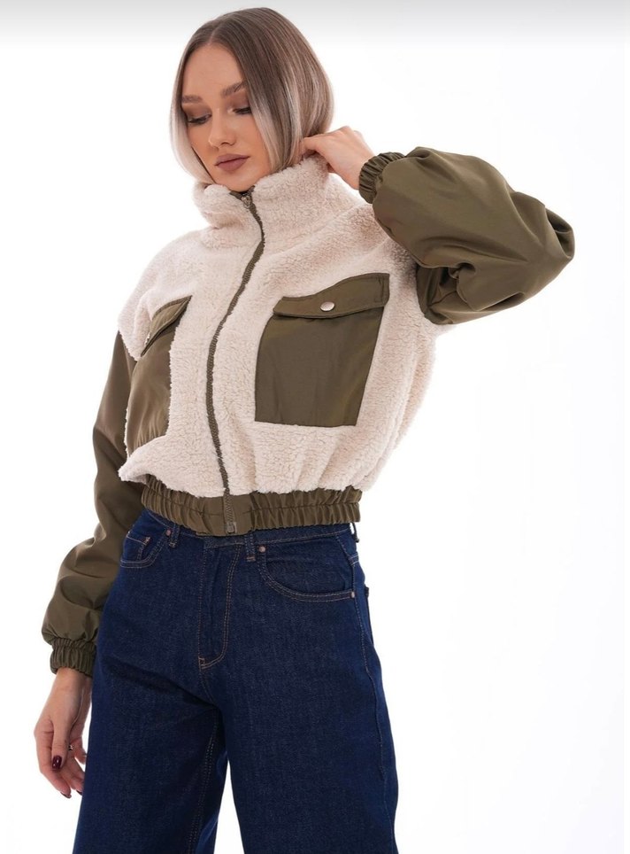 Kürk detaylı, uzun kollu, kısa kesim kadın ceket. Bol kesimli, açık kahverengi ve haki renklerle günlük kullanıma uygun rahat bir tasarım.
