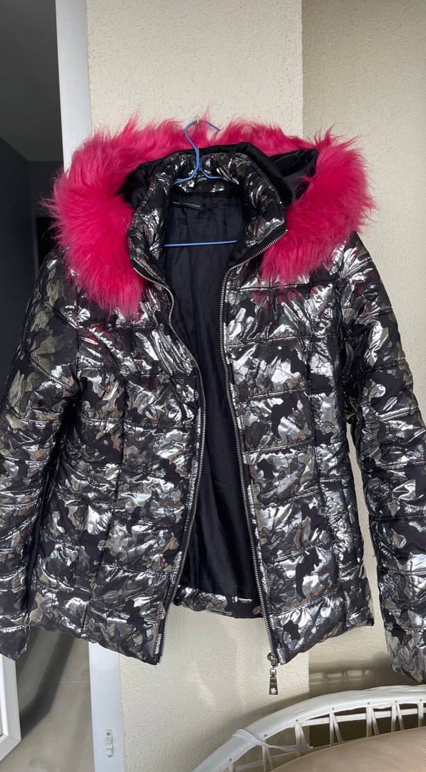 Bu dar kesim, kısa boy kadın kışlık mont, desenli koyu gri sentetik kumaştan ve parlak pembe kürk detaylı kapüşonludur. Sokak stiline uygun, kapüşonlu ve askılı kolludur, dış mekan kullanımı için uygundur. ❄️