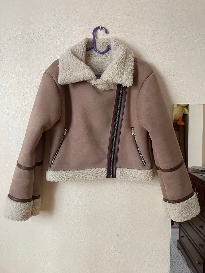 Bu dar kesim kısa kadın ceket, yumuşak süet dış yüzeye ve yakada, manşetlerde ile etekte kürk detayına sahiptir. Çıtçıtlı yakası ve fermuarlı cepleriyle günlük sokak stiline uygundur.