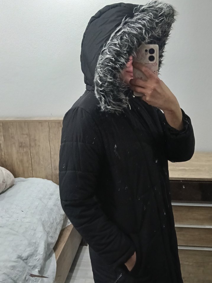 Kürk detaylı kapüşonlu, uzun kollu, koyu gri, midi uzunlukta, rahat ve sıcak tutan kadın kışlık mont. Street wear tarzında, dar kesim ve desensiz.