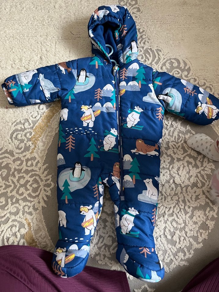 Koyu mavi renkli erkek bebek tulumu, baskılı desenli ve kürk detaylıdır. Yumuşak ve sıcak kumaştan, kapüşonlu ve sokak stili.