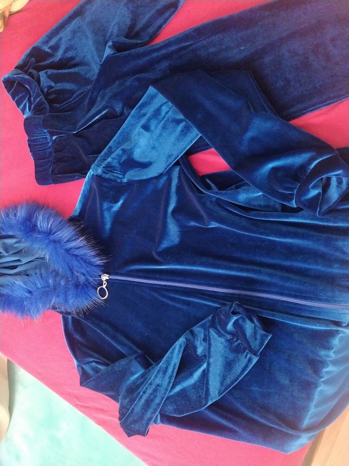 Kürk Detaylı Koyu Mavi Goth Kadife eşofman takımı yeni
