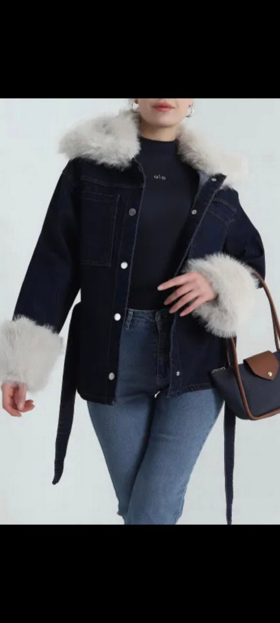 Kürk detaylı, koyu mavi fitted denim ceket, yakasında ve manşetlerinde kürk bulunur. Notched lapel ve strappy kollara sahiptir. Günlük kullanıma uygundur.