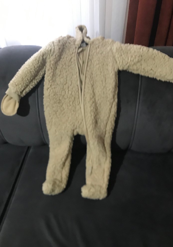 Kürk detaylı, kapüşonlu ve yumuşak kumaştan yapılmış krem bebek tulumu, konfor ve sıcaklık sağlar.