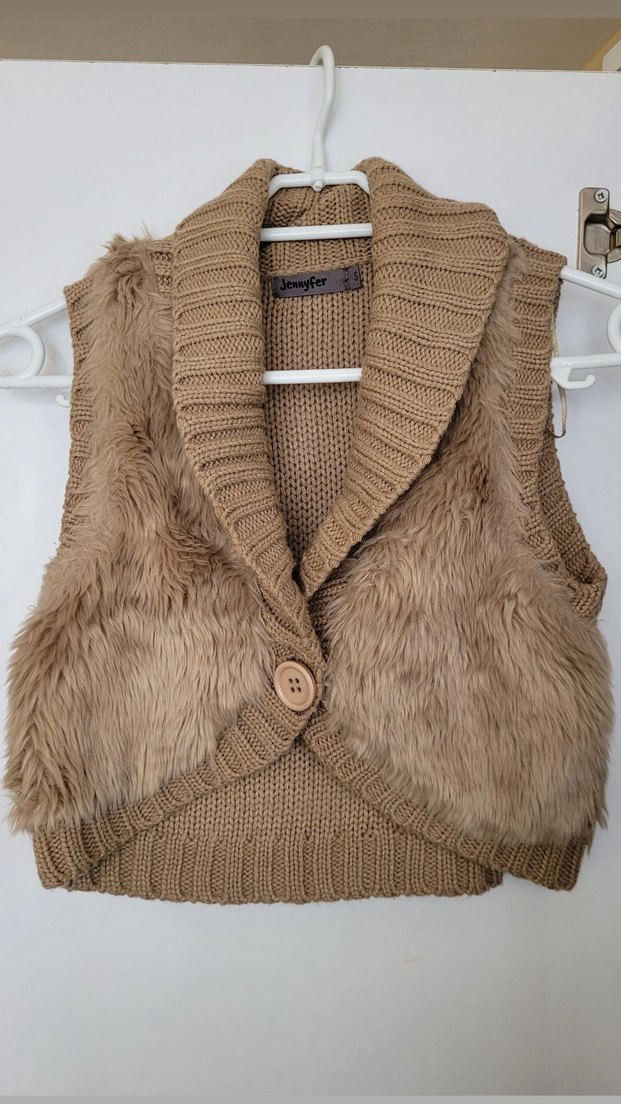 Kürk detaylı krem renkli, triko dokulu, kolsuz ve kısa boy kadın yelek. Düğmeli, yakalı ve dar kesim, günlük şık rahat sokak stili için uygun. xs-s bedene uygun