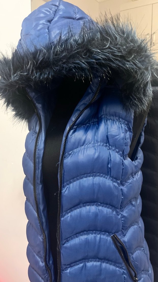 Kürk detaylı, uzun boy, lacivert kadın yelek. Suni kumaştan, kolsuz ve yaka kısmı kesimli. Rahat sokak stili için uygun.