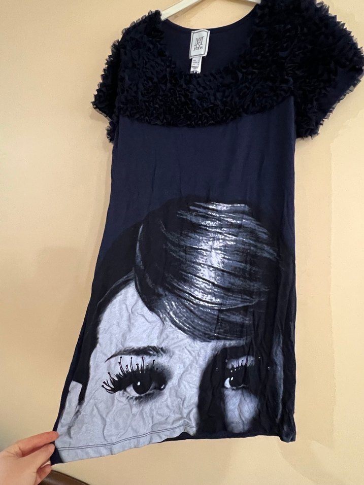 Dar kesim, yakalı ve kısa kollu bu midi elbise, koyu mavi sentetik kumaş üzerine büyük yüz baskısına sahip. Yaka kısmında kürk detay bulunur. Gotik ve avangart tarzda günlük kullanıma uygun.
