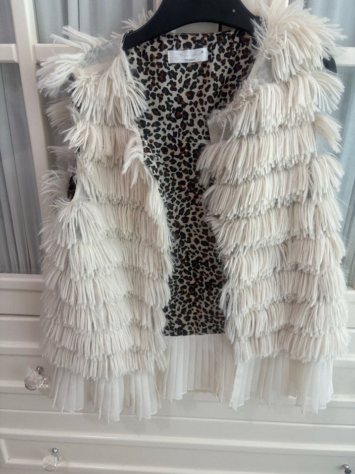 Uzun beyaz, kolsuz, kürk detaylı ve sıkı kesime sahip bohem tarzda çocuk yeleği. Askısız yaka ve zebra desenli astar ile parti için uygun.