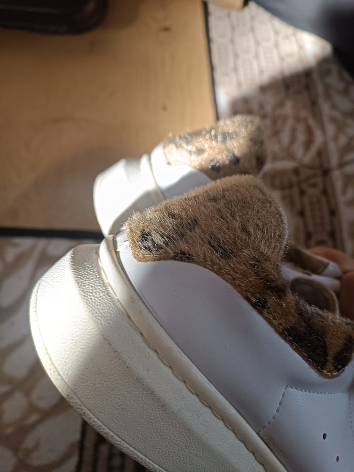 Beyaz platform topuklu kadın spor ayakkabısı, kürk detaylı ve leopar desenlidir. Kauçuk tabanlı, sokak stili ve dış mekan için uygundur.
