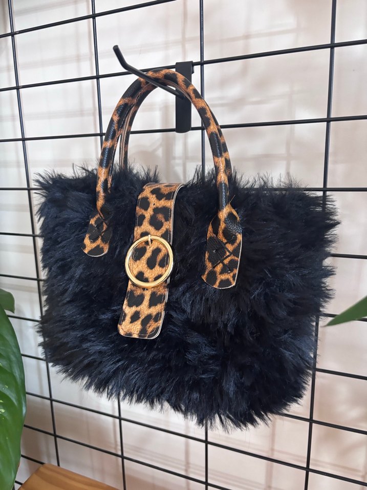 Koyu kürk detaylı, leopar desenli deri sap ve tokalı kadın çantası. Goth ve bohem tarzını Paris retro havasıyla buluşturur.