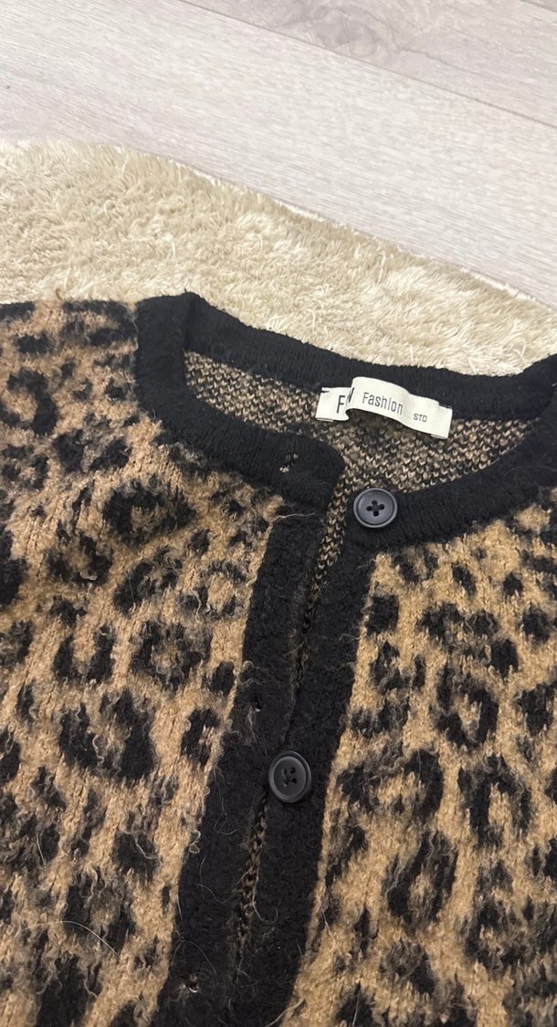 Kürk detaylı, leopar desenli, uzun kollu, yuvarlak yaka, kısa ve bol kesim kadın hırkası. Rahat ve trend sokak stili için uygundur.