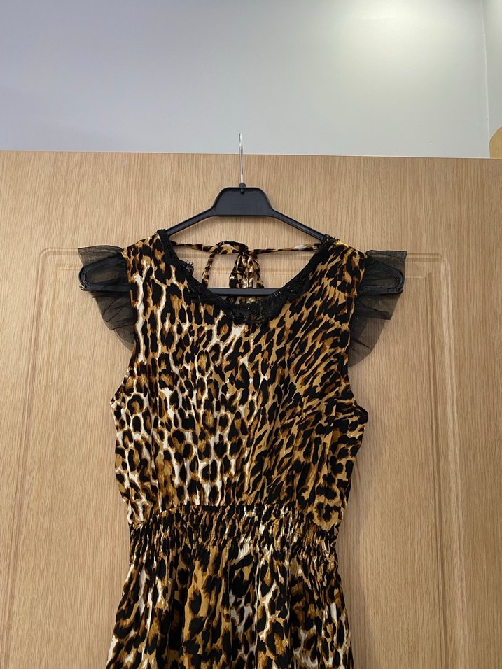 Kürk detaylı, leopar desenli, kolsuz mini elbise. V yakalı, sentetik kumaştan, bohem ve retro tarzda, günlük kullanıma uygun bir tasarım.